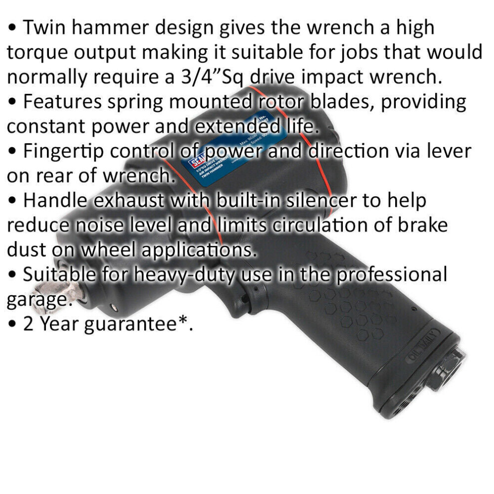 - Twin hammer design gives the wrench a high torque output making it suitable for jobs that would normally require a 3/4"Sq drive impact wrench.